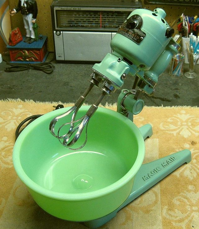 beaters and Star-Rite Magic Maid Model-B Jadite green mixing bowl.